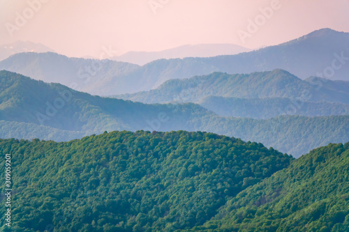 Obraz premium Layers of mountains in the haze during sunset. Beautiful sunset in the hills...