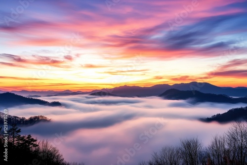 © Lakkhana, Obraz premium Layers of wispy clouds glowing in soft pastel shades during twilight,