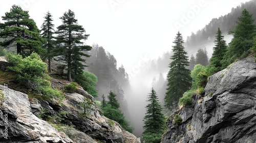 Obraz premium Layout Overlay Transparent Misty Forest Landscape with Rocky Terrain and Pines