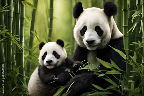 Naklejka premium Lazy giant panda bears in a bamboo forest , panda moms and cubs