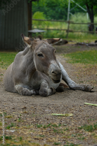 © evolutionnow, Fototapeta premium lazy grey Donkey lying on the ground