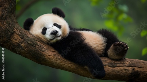 © ANDREI, Obraz premium Lazy Panda Bear Sleeping on a Tree Branch