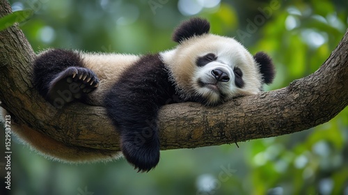 © NAILA, Obraz premium Lazy Panda Bear Sleeping on a Tree Branch,