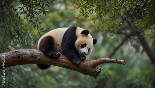 © Kaila, Obraz premium Lazy Panda Bear Sleeping on a Tree Branch