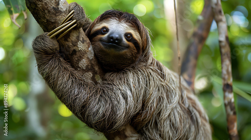 Naklejka premium Lazy sloth hanging from tropical tree