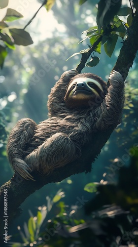Fototapeta premium Lazy sloth in lush green forest