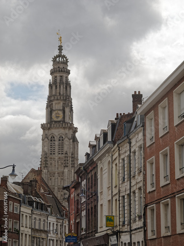 © galaad973, Naklejka premium Le beffroi de l'hôtel de ville d'Arras vu de la rue des trois visages, Arras, Pas-de-Calais, France