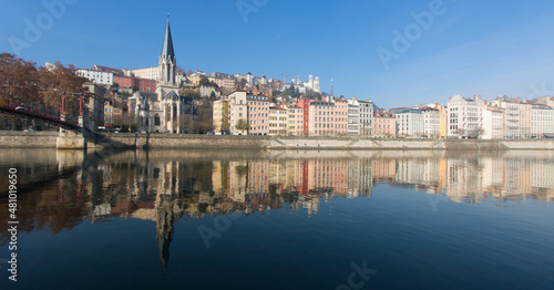 © jef 77, Fototapeta premium le bord de Saône et le quartier du vieux Lyon sous le soleil