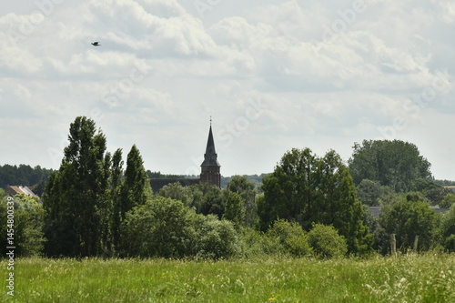 © Photocolorsteph, Fototapeta premium Le clocher de l'église Saint-Jean-l'Évangéliste émergeant des arbres d'un bois à Ghislenghien (Ath)