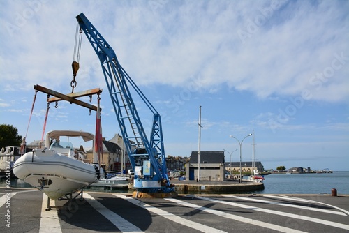 Fototapeta premium Le Croisic - Treuil élévateur de mise à l'eau d'un petit bateau pneumatic semi-rigide de plaisance