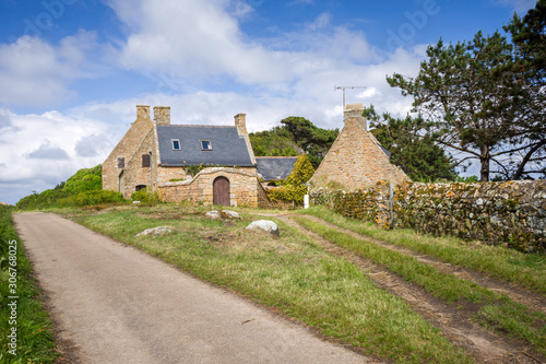 Fototapeta premium île de Bréhat, mur de pierres et maisons, Côtes D'armor, Bretagne