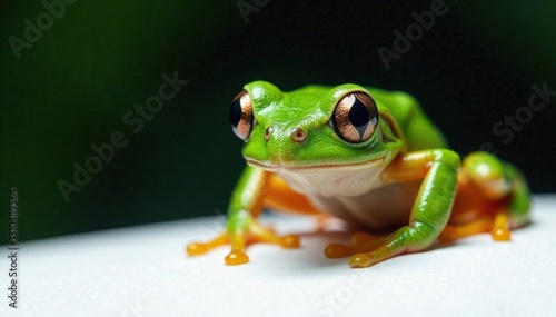 © Prayoon, Naklejka premium Le grenouille dans un panneau blanc avec ses yeux noirs brillants, greenery, white panel, pond