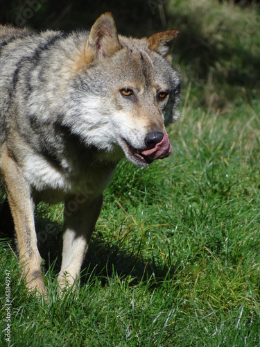 Fototapeta premium Le loup, à l'affût de son repas, se lèche les babines