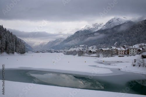 © giovanni, Fototapeta premium le nuvole sulla montagna in inverno, la luce che filtra le nuvole attorno una montagna innevata, lo splendido panorama invernale sulle dolomiti