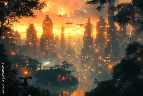 © Alexandre, Fototapeta premium Le paysage urbain futuriste au crépuscule