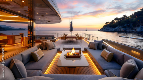 Fototapeta premium Le pont d'un yacht au coucher du soleil.