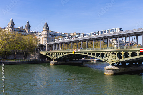 © Gautier Normand, Naklejka premium Le pont de Bir-Hakeim accueille le métro parisien de la ligne 6 sur cette image horizontale. En dessous, la Seine.