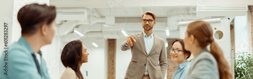 Obraz premium Leader standing in office and explaining new ideas to colleagues