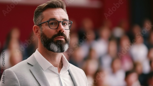 Fototapeta premium Leadership conference keynote speaker engaging audience seminar hall professional event inspiring environment close-up