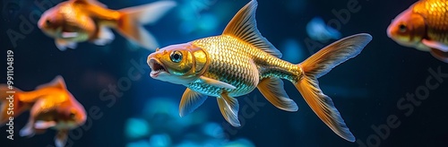 Fototapeta premium Leading Others Through Stormy Seas With A Small Brave Goldfish With Shark Fin Costume
