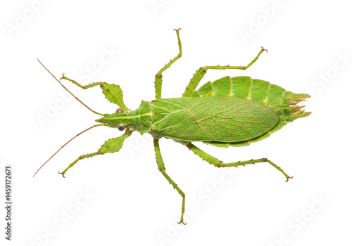 © Elsha, Fototapeta premium Leaf insect portrait on black Green intricate mimicry revealed
