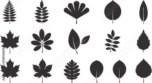 Fototapeta premium Leaf silhouette collection, botanical shapes, black vector leaves, nature icons, foliage design, plant elements, flat vector illustration, isolated leaf set