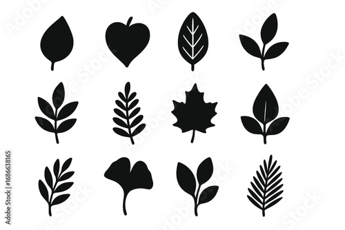 Fototapeta premium Leaf silhouette vector icon set. Collection of black plant and foliage symbols. Botanical graphic elements for eco, nature, and organic design. Maple, ginkgo, and fern shapes.