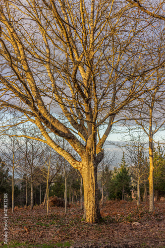 © Droneair, Obraz premium leafless oak illuminated at dusk