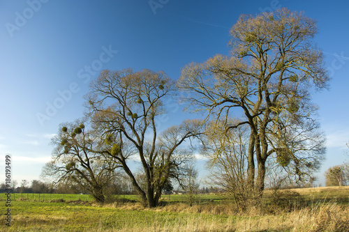 © darekb22, Fototapeta premium Leafless trees with mistletoe on a green meadow and blue sky