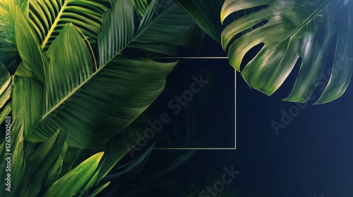 © Nataliia_Trushchenko, Obraz premium Leafy green background with a gold frame. The frame is a rectangle and is placed in the middle of the image