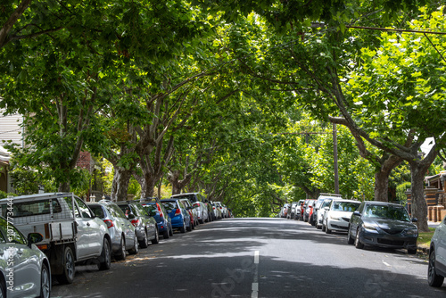 © Doublelee, Fototapeta premium Leafy neighborhood in Kensington, Melbourne, a characteristic inner-city suburban road. Mature and large trees form a natural green canopy, and parked cars line both sides of the quiet street
