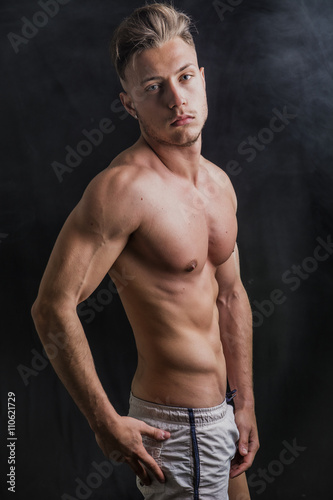 © theartofphoto, Fototapeta premium Lean athletic shirtless young man standing on dark background