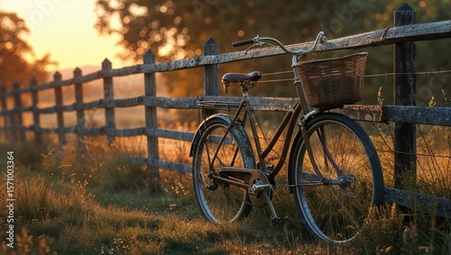Obraz premium Leaning vintage bicycle with wicker basket basking in sunrise light over...