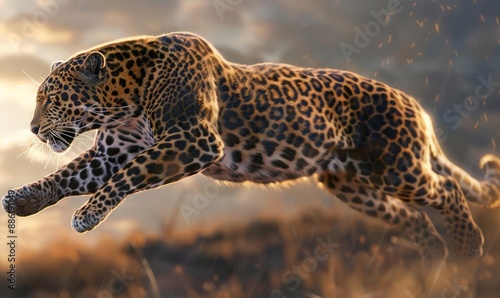 © VGX Ultra, Naklejka premium Leaping Leopard in Sunset Light with Golden and Brown Tones