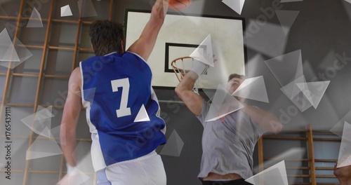 © vectorfusionart, Fototapeta premium Leaping player in blue #7 jersey grabbing orange basketball at gymnasium hoop with climbing racks