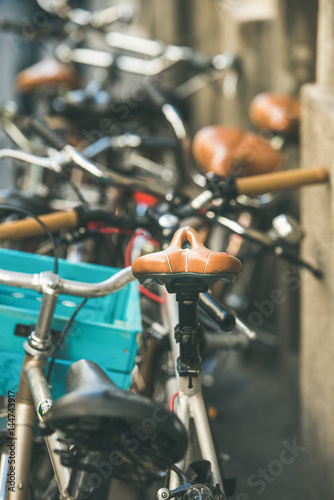Obraz premium Leather saddle of old bicycle parked in the street of Budapest Jewish...