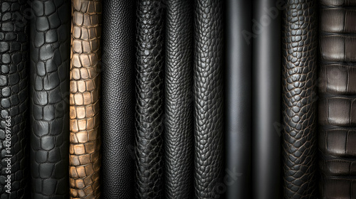 Fototapeta premium Leather textures, vertical arrangement, dark background, design