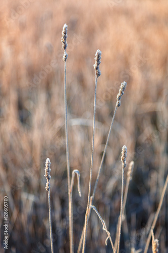 Fototapeta premium Leaves and grass with hoarfrost as a background