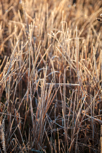 Fototapeta premium Leaves and grass with hoarfrost as a background