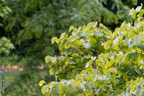 Obraz premium Leaves of a leafy tree with water drops from the rain that is falling on them