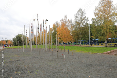© FEDORENKO, Fototapeta premium Leaves of trees in bright autumn colors, heavy autumn sky with rain clouds, but there is still green grass, which is even better shades the colors of autumn