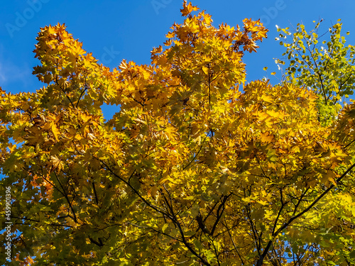 © Elena Belyaeva, Fototapeta premium Leaves on crowns in the fall