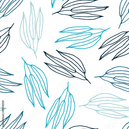 Fototapeta premium Leaves seamless pattern. linear contour on white background. Hand drawn Doodle style blie color. Digital paper for scrapbooking, digital creativity, gift packaging, fabric, wallpaper, other surfaces.