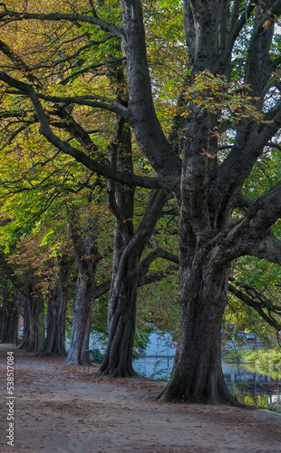 © Dawn, Obraz premium Leaves start to turn in autumn on tree lined city park path next to a river.