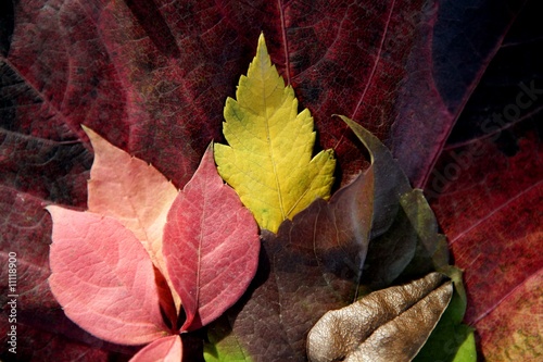 © lunamarina, Obraz premium Leaves still of autumn leaves, dark wood background