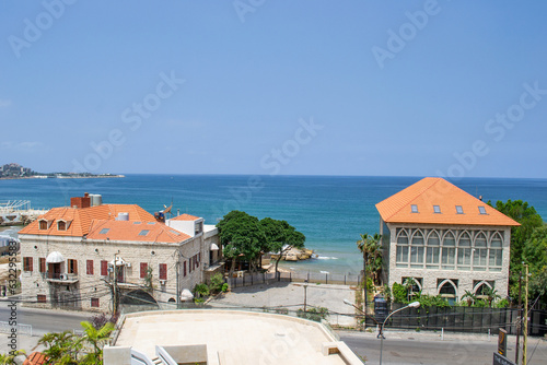© kharzey, Obraz premium lebanon Jounieh Beirut cityscape coast landscape high up sky clouds mounatins mediterranean sea