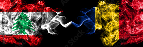 © Vlad, Fototapeta premium Lebanon vs Romania, Romanian smoky mystic flags placed side by side. Thick colored silky abstract smoke flags.