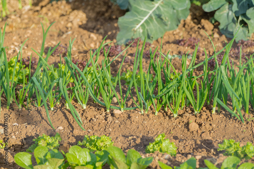 © johnphotostock, Fototapeta premium Leek growing in the garden