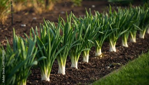 © VolumeThings, Obraz premium Leek plants thrive in vibrant green