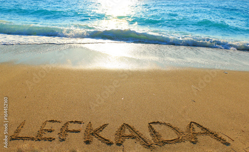 © Željko Radojko, Fototapeta premium Lefkada written on sandy beach in Greece